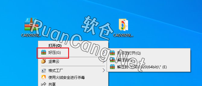 1.鼠标右击【CAD2020】压缩包选择【解压到 CAD2020】。