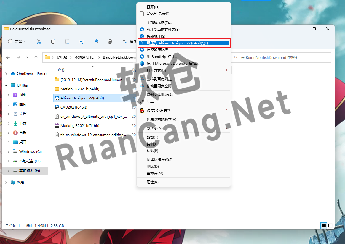 1.鼠标右击【Altium Designer 22(64bit)】压缩包(win11系统需先点击显示“更多选项”)选择【解压到 Altium Designer 22(64bit)】。