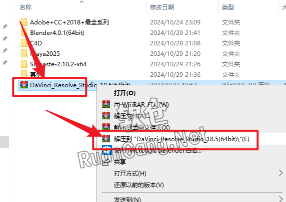1.鼠标右击【DaVinci_Resolve_Studio_18.5(64bit)】压缩包(win11及以上系统需先点击“显示更多选项”)【解压到 DaVinci_Resolve_Studio_18.5(64bit)】。